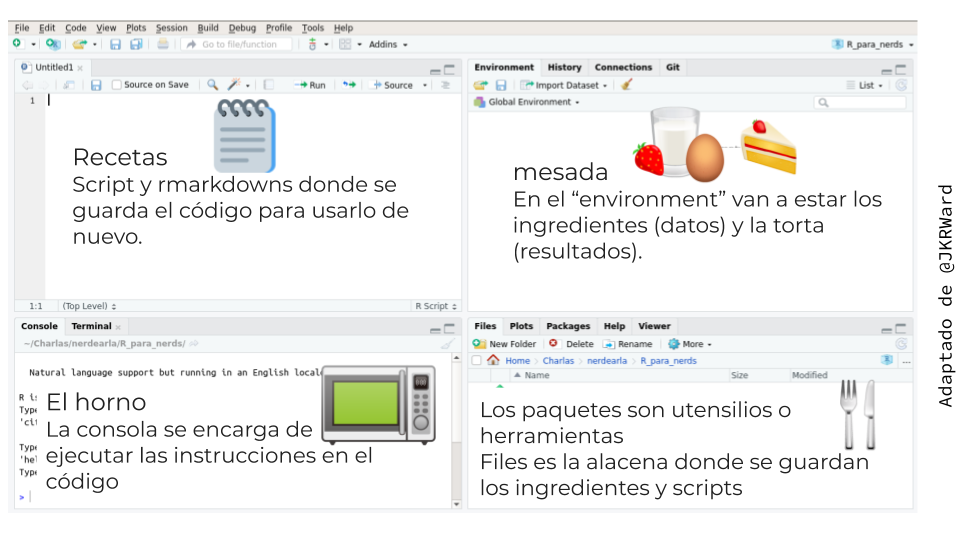 background-color: #272822 <br> <br> <br> <br> <br> <br> <h1 style='color:white'> <center> R para contextos humanitarios de emergencia</center></h1> ## <center><font style='color:#E495A5'>I</font><font style='color:#D89F7F'>n</font><font style='color:#BDAB66'>t</font><font style='color:#96B56C'>r</font><font style='color:#65BC8C'>o</font><font style='color:#39BEB1'>d</font><font style='color:#55B8D0'>u</font><font style='color:#91ACE1'>c</font><font style='color:#C29DDE'>c</font><font style='color:#DE94C8'>i</font><font style='color:#E495A5'>ó</font><font style='color:#D89F7F'>n</font></center> ### <center><font style='color:#E495A5'>V</font><font style='color:#D89F7F'>i</font><font style='color:#BDAB66'>o</font><font style='color:#96B56C'>l</font><font style='color:#65BC8C'>e</font><font style='color:#39BEB1'>t</font><font style='color:#55B8D0'>a</font> <font style='color:#91ACE1'>R</font><font style='color:#C29DDE'>o</font><font style='color:#DE94C8'>i</font><font style='color:#E495A5'>z</font><font style='color:#D89F7F'>m</font><font style='color:#BDAB66'>a</font><font style='color:#96B56C'>n</font></center> --- <div class="my-header"></div> ##<font style='color:#E495A5'>H</font><font style='color:#D89F7F'>o</font><font style='color:#BDAB66'>l</font><font style='color:#96B56C'>a</font><font style='color:#65BC8C'>!</font> - Me llamo **Violeta** - Soy **Matemática** e **Instructora Certificada por RStudio** - Me gusta **visualizar datos, visitar museos, tomar té, etc, etc.** <center> <img src="img/grafico.jpg" alt="Visualización de datos" width="250"> <img src="img/te.jpg" alt="Té" width="280"> </center> <center> <img src="img/museo.jpg" alt="Museo Pompidou" width="200"> </center> --- <div class="my-header"></div> ## Objetivos del taller - Entender qué son y para qué sirven R y RStudio - Saber buscar ayuda en el mundo R - Poder hacer un análisis de datos sencillo y completo, todo en R - Poder aprovechar R para introducirlo en su flujo de trabajo habitual ## Modalidad del taller - Presentación de los temas con ejemplos - Ejercicios intercalados para interactuar - "Live coding" ## Requisitos - Asumimos que ya tienen instalado R y RStudio - En caso contrario: seguir los pasos de [este video](https://www.youtube.com/watch?v=GkItqGfCkog&feature=youtu.be) - También necesitamos PowerBI para el segundo día --- <div class="my-header"></div> ## Desafíos de hoy - Entender qué es R y qué es RStudio - Aprender a organizar nuestros proyectos (de R) - Leer correctamente una base de datos - Generar nuevas columnas a partir de información de otras columnas y generar resúmenes a partir de los datos --- <div class="my-header"></div> ## <font style='color:#E495A5'>Q</font><font style='color:#D89F7F'>u</font><font style='color:#BDAB66'>é</font> <font style='color:#96B56C'>h</font><font style='color:#65BC8C'>e</font><font style='color:#39BEB1'>r</font><font style='color:#55B8D0'>r</font><font style='color:#91ACE1'>a</font><font style='color:#C29DDE'>m</font><font style='color:#DE94C8'>i</font><font style='color:#E495A5'>e</font><font style='color:#D89F7F'>n</font><font style='color:#BDAB66'>t</font><font style='color:#96B56C'>a</font><font style='color:#65BC8C'>s</font> <font style='color:#39BEB1'>p</font><font style='color:#55B8D0'>a</font><font style='color:#91ACE1'>r</font><font style='color:#C29DDE'>a</font> <font style='color:#DE94C8'>a</font><font style='color:#E495A5'>n</font><font style='color:#D89F7F'>á</font><font style='color:#BDAB66'>l</font><font style='color:#96B56C'>i</font><font style='color:#65BC8C'>s</font><font style='color:#39BEB1'>i</font><font style='color:#55B8D0'>s</font> <font style='color:#91ACE1'>d</font><font style='color:#C29DDE'>e</font> <font style='color:#DE94C8'>d</font><font style='color:#E495A5'>a</font><font style='color:#D89F7F'>t</font><font style='color:#BDAB66'>o</font><font style='color:#96B56C'>s</font> <font style='color:#65BC8C'>u</font><font style='color:#39BEB1'>t</font><font style='color:#55B8D0'>i</font><font style='color:#91ACE1'>l</font><font style='color:#C29DDE'>i</font><font style='color:#DE94C8'>z</font><font style='color:#E495A5'>a</font><font style='color:#D89F7F'>n</font><font style='color:#BDAB66'>?</font> .flex[ .can-edit[ - Excel - GIS - Power BI - Word ] ] .flex[ .w-50[ **Ventajas** .can-edit.key-rstudio-gets-me[ - Intuitivos para usar ] ] .w-50[ **Desventajas** .can-edit.key-rstudio-gets-me-not[ - Son muy específicos para cada tarea ] ] ] --- <div class="my-header"></div> ## Si ya tenemos: - Excel - Kobo - GIS - Power BI - Word - InDesign - Ilustrator ## Entonces por qué R? ## Porque con R podemos: - Realizar la mayoría de esas tareas - Automatizar procesos - Interactuar fácilmente con muchas herramientas Y además... es abierto y gratuito --- <div class="my-header"></div> ## <font style='color:#E495A5'>D</font><font style='color:#D89F7F'>e</font><font style='color:#BDAB66'>s</font><font style='color:#96B56C'>v</font><font style='color:#65BC8C'>e</font><font style='color:#39BEB1'>n</font><font style='color:#55B8D0'>t</font><font style='color:#91ACE1'>a</font><font style='color:#C29DDE'>j</font><font style='color:#DE94C8'>a</font><font style='color:#E495A5'>:</font> <font style='color:#D89F7F'>l</font><font style='color:#BDAB66'>a</font> <font style='color:#96B56C'>t</font><font style='color:#65BC8C'>í</font><font style='color:#39BEB1'>p</font><font style='color:#55B8D0'>i</font><font style='color:#91ACE1'>c</font><font style='color:#C29DDE'>a</font> <font style='color:#DE94C8'>r</font><font style='color:#E495A5'>e</font><font style='color:#D89F7F'>l</font><font style='color:#BDAB66'>a</font><font style='color:#96B56C'>c</font><font style='color:#65BC8C'>i</font><font style='color:#39BEB1'>ó</font><font style='color:#55B8D0'>n</font> <font style='color:#91ACE1'>d</font><font style='color:#C29DDE'>e</font> <font style='color:#DE94C8'>u</font><font style='color:#E495A5'>n</font> <font style='color:#D89F7F'>u</font><font style='